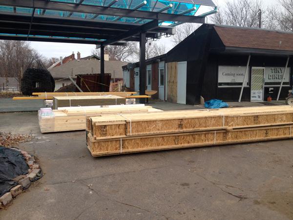 Monday was a historic day for the solar industry in Minnesota. It was a long time coming but we pulled off an extraordinary feat that day. At 7pm we craned into place the largest single PV array ever lifted in one piece in the state of Minnesota, and possibly all of North America. A custom fabricated array consisting of 84 tenKsolar panels and reflectors was raised 13 feet off the ground and placed onto four steel posts above an outdoor seating area at the future site of Kim Bartman's new restaurant adventure – the Tiny Diner on East 38th St. The Tiny Diner adds to the chain of restaurants, Barbette, Bryant Lake Bowl, Red Stag Supper Club. Pat’s Tap, Bread & Pickle, Gigi’s Cafe.